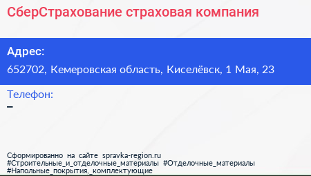 СберСтрахование, страховая компания по адресу 652702, Кемеровская область, Киселёвск, 1 Мая, 23 в дальнейшем Организация, размещена в следующих категориях: