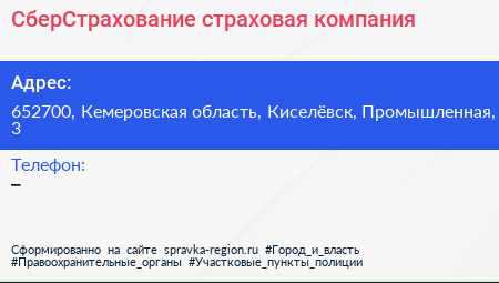 СберСтрахование, страховая компания по адресу 652700, Кемеровская область, Киселёвск, Промышленная, 3 в дальнейшем Организация, размещена в следующих категориях: