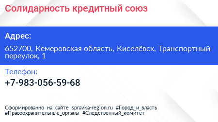 Солидарность, кредитный союз по адресу 652700, Кемеровская область, Киселёвск, Транспортный переулок, 1 в дальнейшем Организация, размещена в следующих категориях: