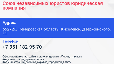 Союз независимых юристов, юридическая компания по адресу 652726, Кемеровская область, Киселёвск, Дзержинского, 11 в дальнейшем Организация, размещена в следующих категориях: