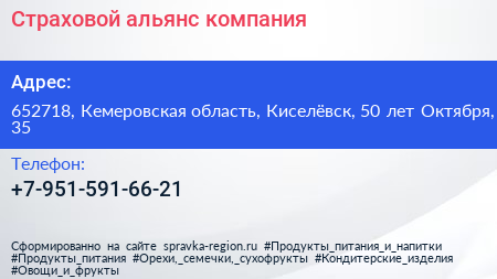 Страховой альянс, компания по адресу 652718, Кемеровская область, Киселёвск, 50 лет Октября, 35 в дальнейшем Организация, размещена в следующих категориях: