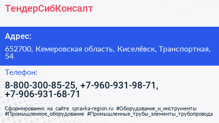 ТендерСибКонсалт по адресу 652700, Кемеровская область, Киселёвск, Транспортная, 54 в дальнейшем Организация, размещена в следующих категориях: