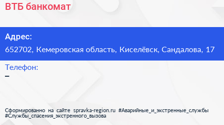 ВТБ, банкомат по адресу 652702, Кемеровская область, Киселёвск, Сандалова, 17 в дальнейшем Организация, размещена в следующих категориях: