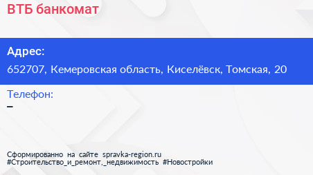 ВТБ, банкомат по адресу 652707, Кемеровская область, Киселёвск, Томская, 20 в дальнейшем Организация, размещена в следующих категориях: