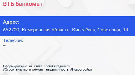 ВТБ, банкомат по адресу 652700, Кемеровская область, Киселёвск, Советская, 14 в дальнейшем Организация, размещена в следующих категориях: