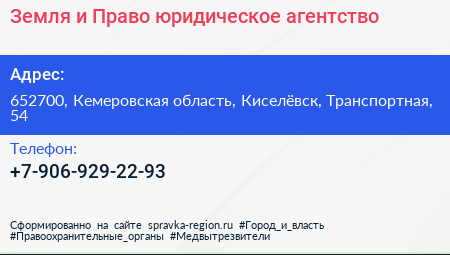 Земля и Право, юридическое агентство по адресу 652700, Кемеровская область, Киселёвск, Транспортная, 54 в дальнейшем Организация, размещена в следующих категориях: