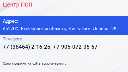 Центр ПСП по адресу 652700, Кемеровская область, Киселёвск, Ленина, 28 в дальнейшем Организация, размещена в следующих категориях: