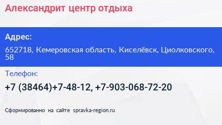 Александрит, центр отдыха по адресу 652718, Кемеровская область, Киселёвск, Циолковского, 58 в дальнейшем Организация, размещена в следующих категориях: