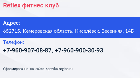 Reflex, фитнес-клуб по адресу 652715, Кемеровская область, Киселёвск, Весенняя, 14Б в дальнейшем Организация, размещена в следующих категориях: