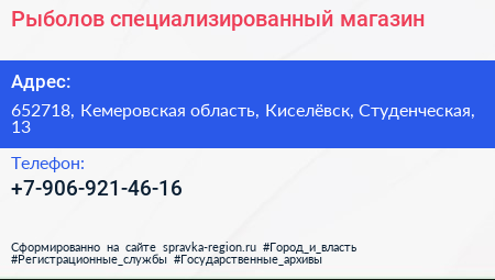 Рыболов, специализированный магазин по адресу 652718, Кемеровская область, Киселёвск, Студенческая, 13 в дальнейшем Организация, размещена в следующих категориях: