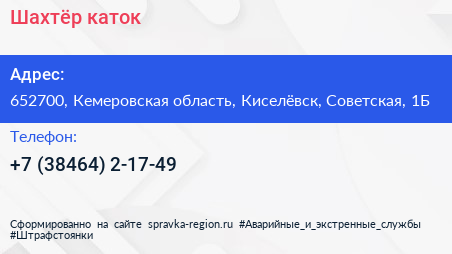 Шахтёр, каток по адресу 652700, Кемеровская область, Киселёвск, Советская, 1Б в дальнейшем Организация, размещена в следующих категориях: