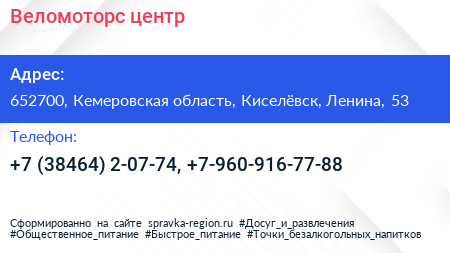Веломоторс, центр по адресу 652700, Кемеровская область, Киселёвск, Ленина, 53 в дальнейшем Организация, размещена в следующих категориях: