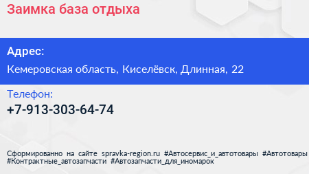 Заимка, база отдыха по адресу Кемеровская область, Киселёвск, Длинная, 22 в дальнейшем Организация, размещена в следующих категориях: