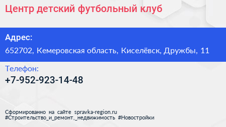 Центр, детский футбольный клуб по адресу 652702, Кемеровская область, Киселёвск, Дружбы, 11 в дальнейшем Организация, размещена в следующих категориях:
