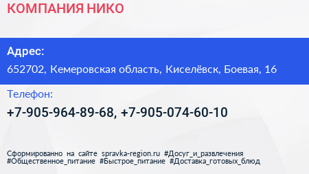 КОМПАНИЯ НИКО по адресу 652702, Кемеровская область, Киселёвск, Боевая, 16 в дальнейшем Организация, размещена в следующих категориях:
