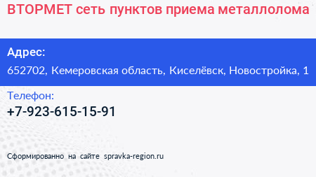 ВТОРМЕТ, сеть пунктов приема металлолома по адресу 652702, Кемеровская область, Киселёвск, Новостройка, 1 в дальнейшем Организация, размещена в следующих категориях: