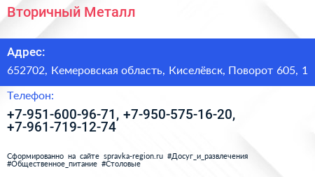 Вторичный Металл по адресу 652702, Кемеровская область, Киселёвск, Поворот 605, 1 в дальнейшем Организация, размещена в следующих категориях: