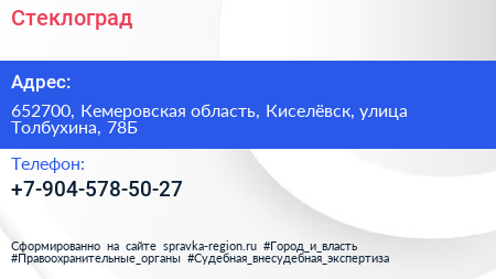 Стеклоград по адресу 652700, Кемеровская область, Киселёвск, улица Толбухина, 78Б в дальнейшем Организация, размещена в следующих категориях: