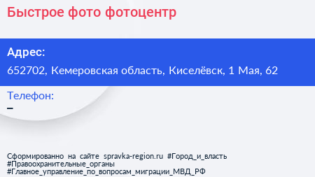 Быстрое фото, фотоцентр по адресу 652702, Кемеровская область, Киселёвск, 1 Мая, 62 в дальнейшем Организация, размещена в следующих категориях: