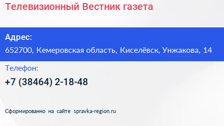 Телевизионный Вестник, газета по адресу 652700, Кемеровская область, Киселёвск, Унжакова, 14 в дальнейшем Организация, размещена в следующих категориях: