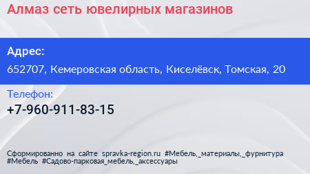 Алмаз, сеть ювелирных магазинов по адресу 652707, Кемеровская область, Киселёвск, Томская, 20 в дальнейшем Организация, размещена в следующих категориях: