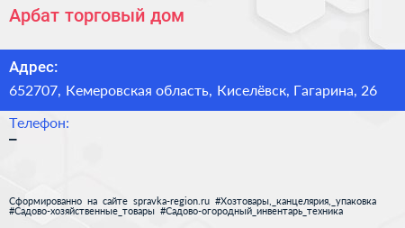 Арбат, торговый дом по адресу 652707, Кемеровская область, Киселёвск, Гагарина, 26 в дальнейшем Организация, размещена в следующих категориях: