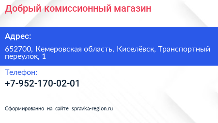 Добрый, комиссионный магазин по адресу 652700, Кемеровская область, Киселёвск, Транспортный переулок, 1 в дальнейшем Организация, размещена в следующих категориях: