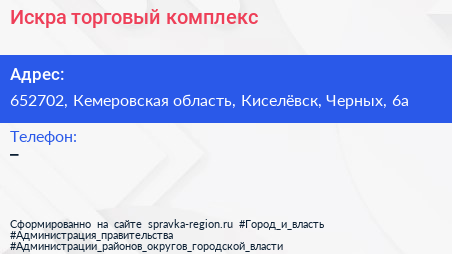 Искра, торговый комплекс по адресу 652702, Кемеровская область, Киселёвск, Черных, 6а в дальнейшем Организация, размещена в следующих категориях: