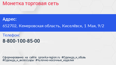 Монетка, торговая сеть по адресу 652702, Кемеровская область, Киселёвск, 1 Мая, 9/2 в дальнейшем Организация, размещена в следующих категориях: