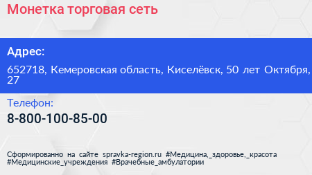 Монетка, торговая сеть по адресу 652718, Кемеровская область, Киселёвск, 50 лет Октября, 27 в дальнейшем Организация, размещена в следующих категориях: