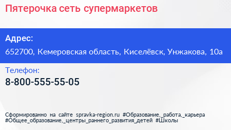 Пятерочка, сеть супермаркетов по адресу 652700, Кемеровская область, Киселёвск, Унжакова, 10а в дальнейшем Организация, размещена в следующих категориях: