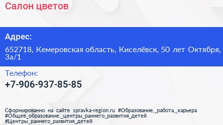 Салон цветов по адресу 652718, Кемеровская область, Киселёвск, 50 лет Октября, 3а/1 в дальнейшем Организация, размещена в следующих категориях: