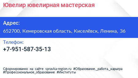 Ювелир, ювелирная мастерская по адресу 652700, Кемеровская область, Киселёвск, Ленина, 36 в дальнейшем Организация, размещена в следующих категориях:
