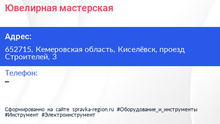 Ювелирная мастерская по адресу 652715, Кемеровская область, Киселёвск, проезд Строителей, 3 в дальнейшем Организация, размещена в следующих категориях: