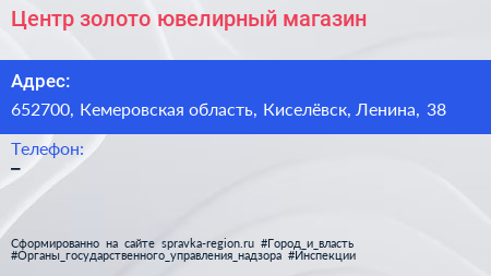 Центр золото, ювелирный магазин по адресу 652700, Кемеровская область, Киселёвск, Ленина, 38 в дальнейшем Организация, размещена в следующих категориях:
