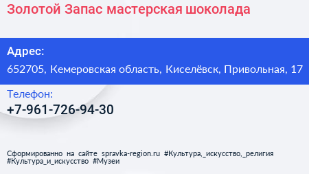 Золотой Запас, мастерская шоколада по адресу 652705, Кемеровская область, Киселёвск, Привольная, 17 в дальнейшем Организация, размещена в следующих категориях: