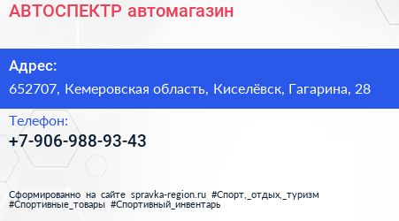 АВТОСПЕКТР, автомагазин по адресу 652707, Кемеровская область, Киселёвск, Гагарина, 28 в дальнейшем Организация, размещена в следующих категориях: