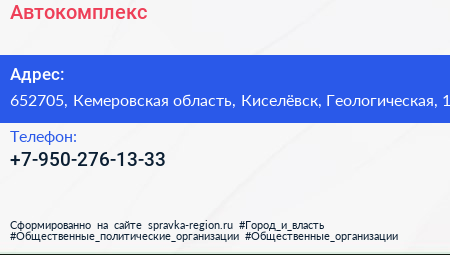 Автокомплекс по адресу 652705, Кемеровская область, Киселёвск, Геологическая, 1 в дальнейшем Организация, размещена в следующих категориях: