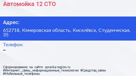 Автомойка #12, СТО по адресу 652718, Кемеровская область, Киселёвск, Студенческая, 35 в дальнейшем Организация, размещена в следующих категориях: