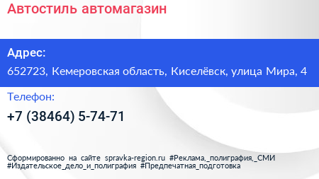 Автостиль, автомагазин по адресу 652723, Кемеровская область, Киселёвск, улица Мира, 4 в дальнейшем Организация, размещена в следующих категориях: