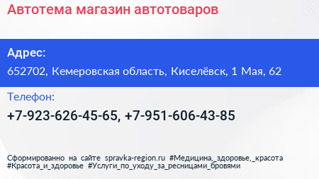 Автотема, магазин автотоваров по адресу 652702, Кемеровская область, Киселёвск, 1 Мая, 62 в дальнейшем Организация, размещена в следующих категориях: