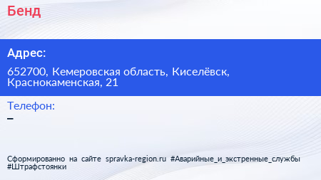 Бенд по адресу 652700, Кемеровская область, Киселёвск, Краснокаменская, 21 в дальнейшем Организация, размещена в следующих категориях: