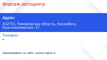 Форсаж, автоцентр по адресу 652715, Кемеровская область, Киселёвск, Краснокаменская, 17 в дальнейшем Организация, размещена в следующих категориях: