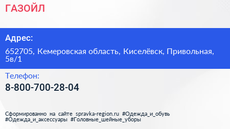 ГАЗОЙЛ по адресу 652705, Кемеровская область, Киселёвск, Привольная, 5в/1 в дальнейшем Организация, размещена в следующих категориях: