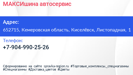 МАКСИшина, автосервис по адресу 652715, Кемеровская область, Киселёвск, Листопадная, 1 в дальнейшем Организация, размещена в следующих категориях: