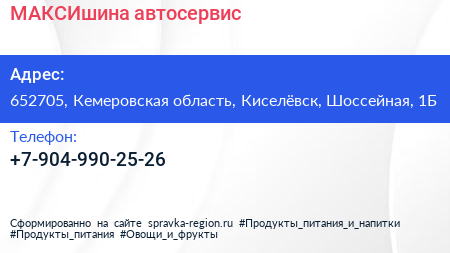 МАКСИшина, автосервис по адресу 652705, Кемеровская область, Киселёвск, Шоссейная, 1Б в дальнейшем Организация, размещена в следующих категориях: