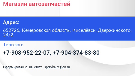Магазин автозапчастей по адресу 652726, Кемеровская область, Киселёвск, Дзержинского, 24/2 в дальнейшем Организация, размещена в следующих категориях: