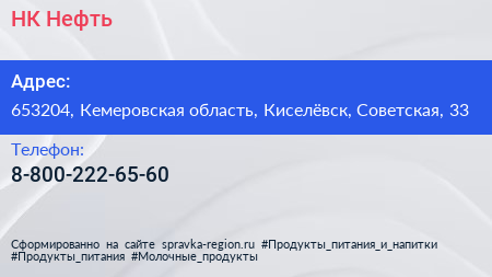 НК-Нефть по адресу 653204, Кемеровская область, Киселёвск, Советская, 33 в дальнейшем Организация, размещена в следующих категориях: