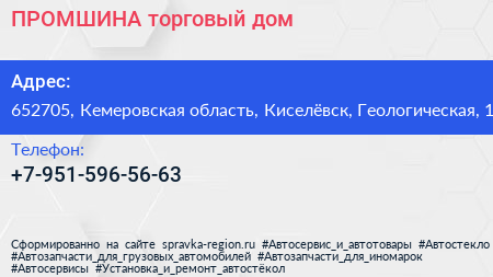 ПРОМШИНА, торговый дом по адресу 652705, Кемеровская область, Киселёвск, Геологическая, 1 в дальнейшем Организация, размещена в следующих категориях: