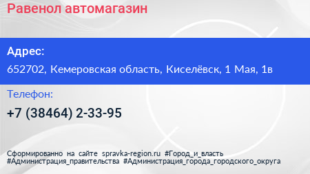 Равенол, автомагазин по адресу 652702, Кемеровская область, Киселёвск, 1 Мая, 1в в дальнейшем Организация, размещена в следующих категориях: